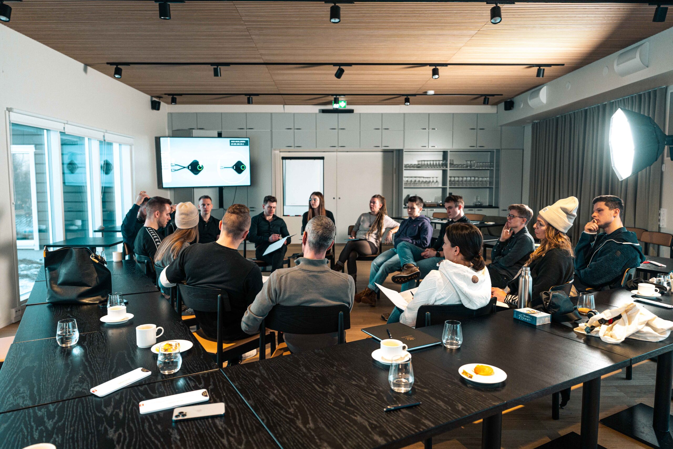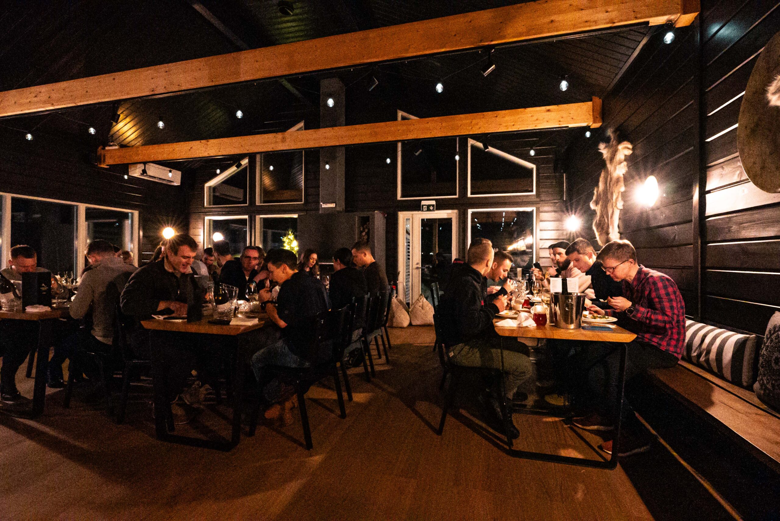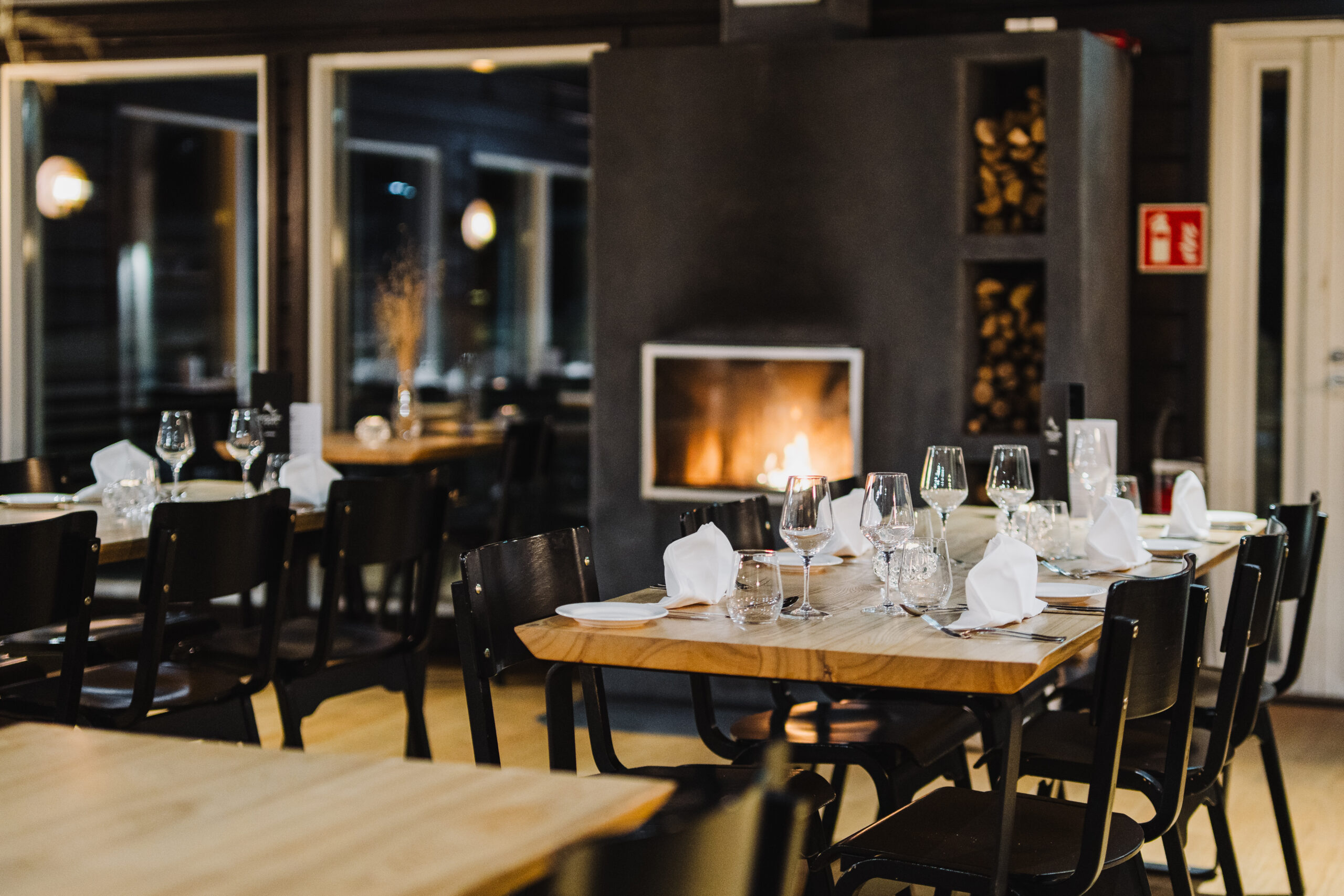 The restaurant consists of two separate dining rooms: one rustic with traditional Lappish interior design style and a high ceiling, and one more modern multifunctional room ideal for group dinners and private parties. Both dining rooms have a big fireplace creating a warm atmosphere with soothing music being played in the background.