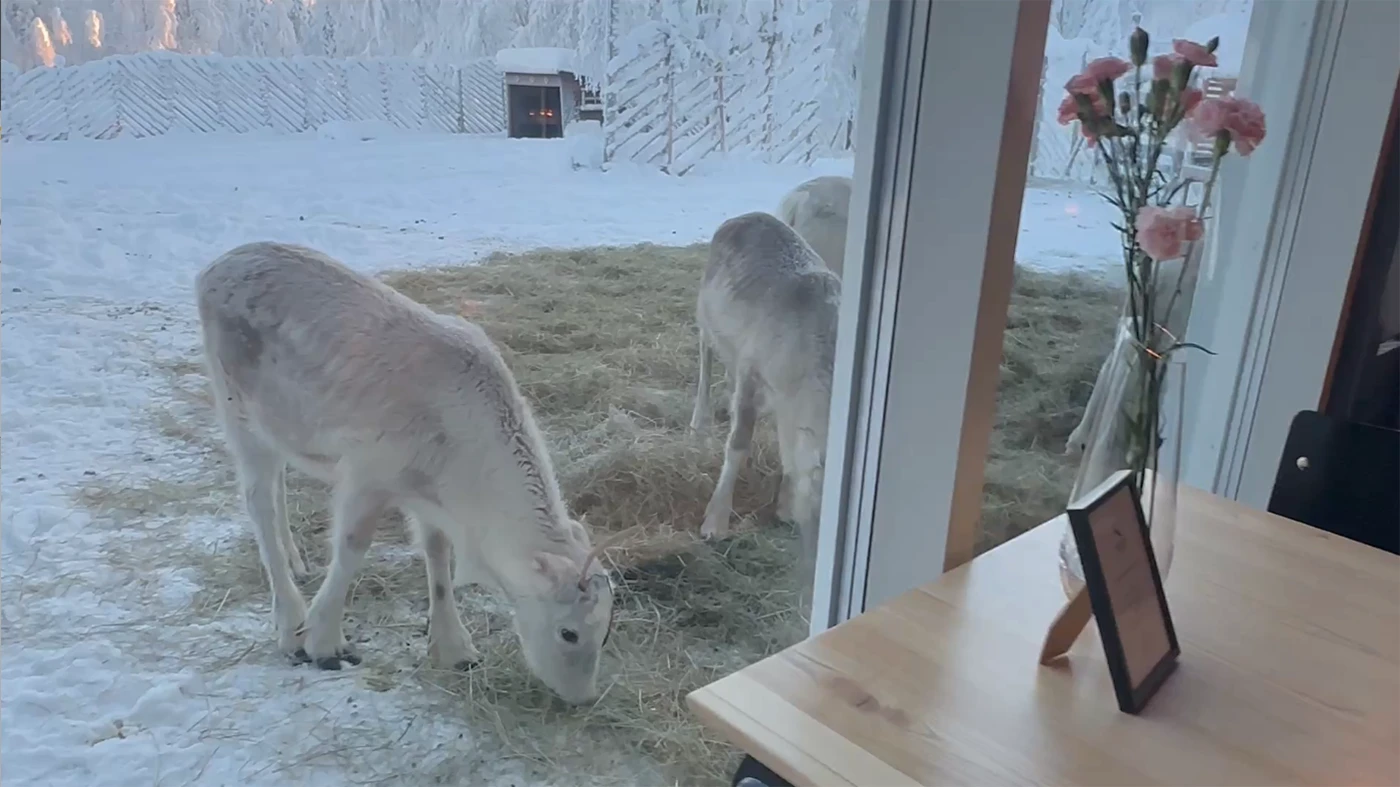 The special feature of both dining rooms and the bar area is the floor-to-ceiling windows opening towards our illuminated reindeer enclosure. That allows the guests the unique experience to observe our reindeer while dining, and are also welcome to feed them later.