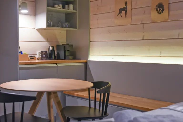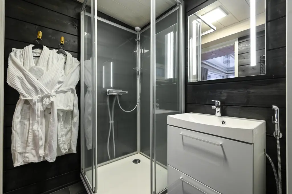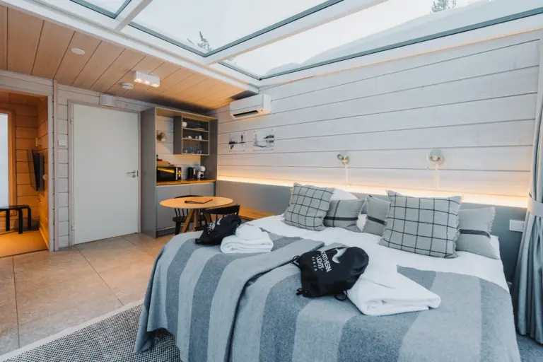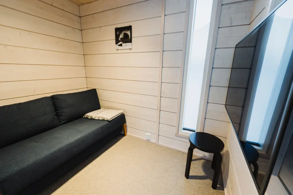 The large windows and a heated glass ceiling guarantee a splendid view of the Northern sky and the surrounding nature. Sky View Cabin Deluxe also includes an alcove with a TV and a sofa-bed, which can be used as an extra bed for 1 adult or 1-2 children (3–12 yrs).