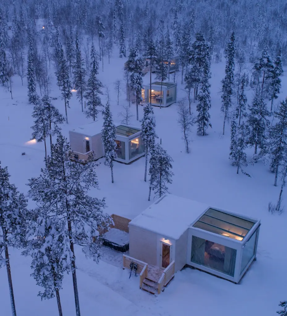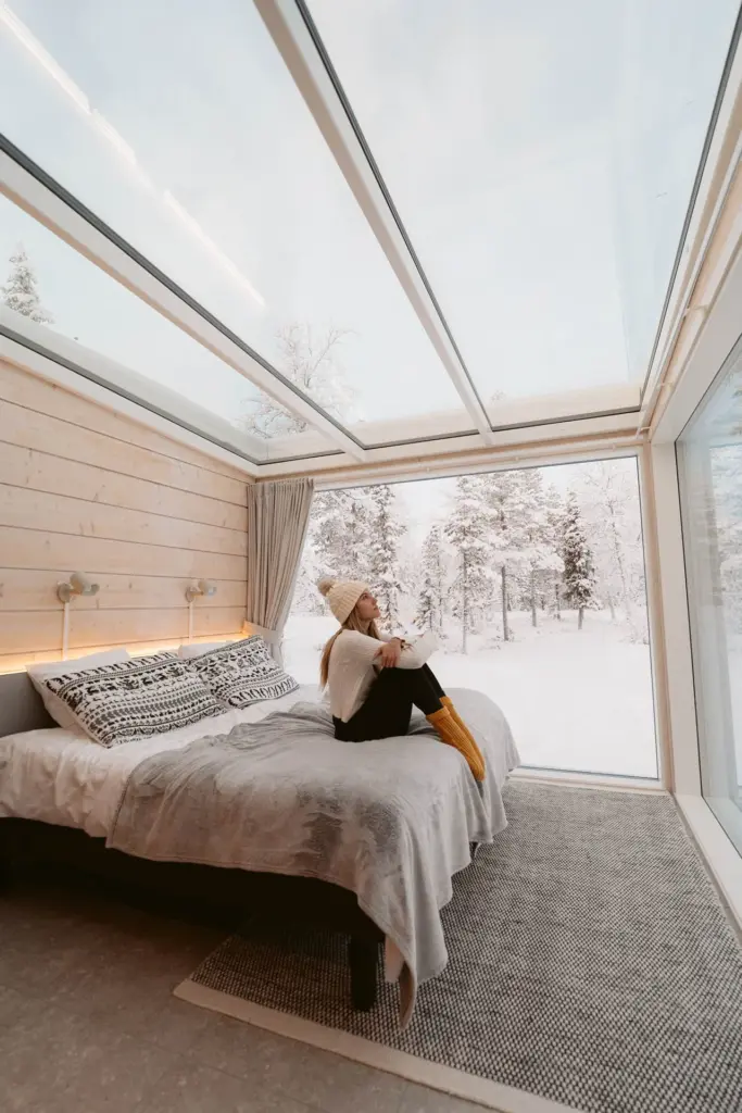Sky View Cabin Deluxe glass-igloo type cabin upgrades your northern light holiday to the next level. Deluxe Cabin features a private outdoor hot tub designed especially for the Northern Lights Ranch hotel. Enjoying the silence and the surrounding winter landscape under the stars and aurora borealis from the luxury of your own hot tub is an experience you’ll surely remember for a lifetime.
