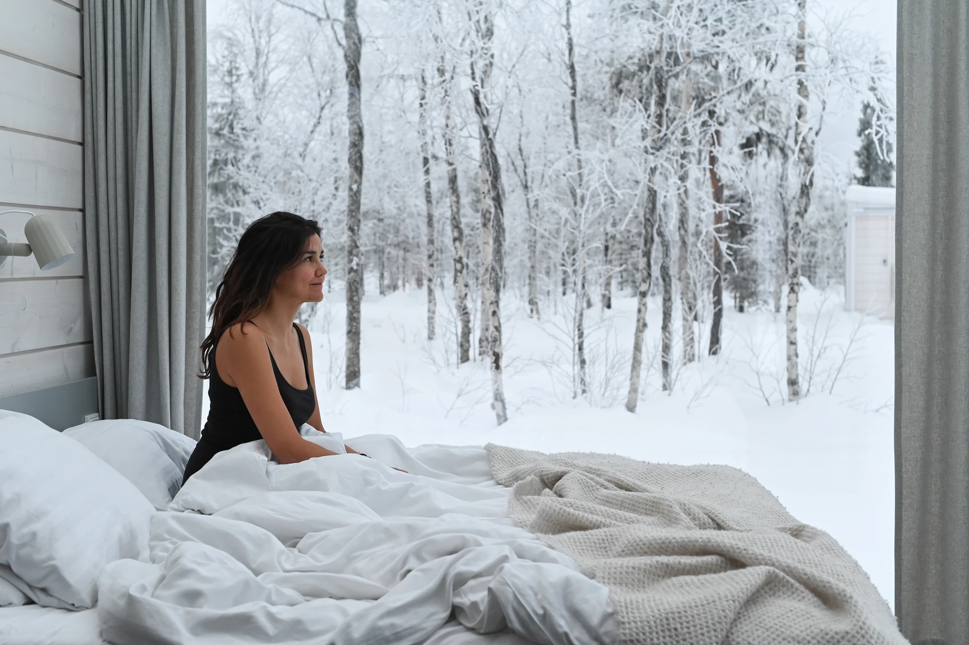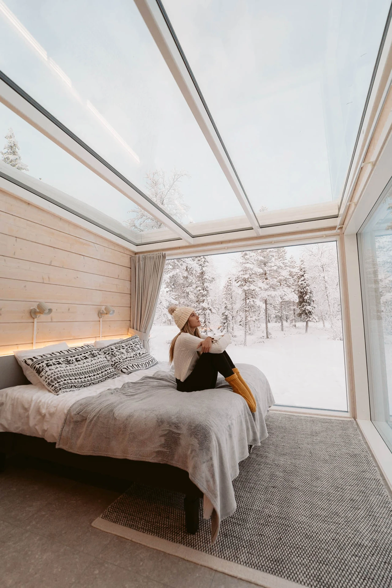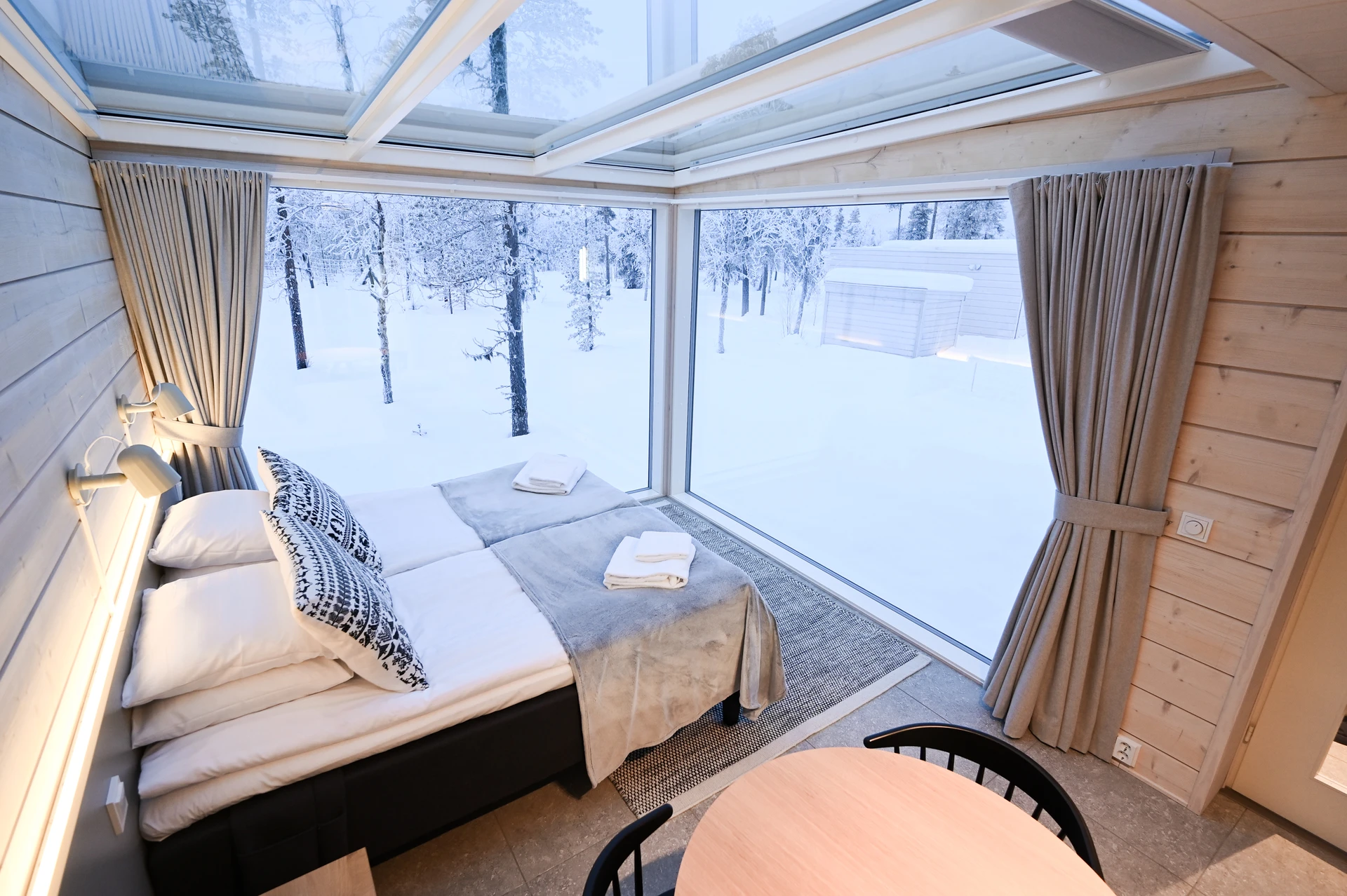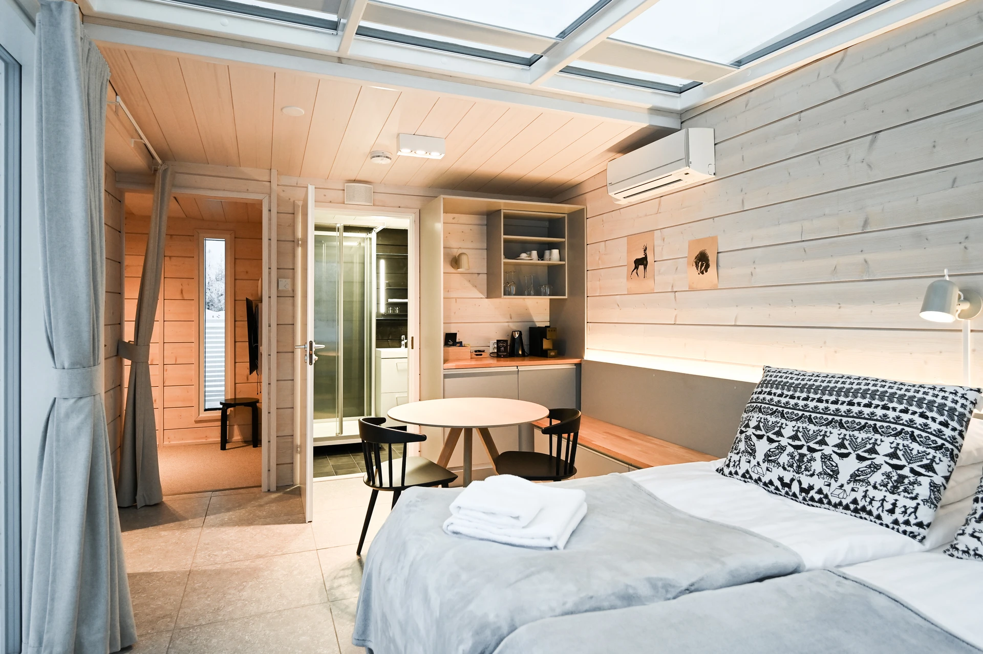 The large windows and a heated glass ceiling guarantee a splendid view of the Northern sky and the surrounding nature. Sky View Cabin Deluxe also includes an alcove with a TV and a sofa-bed, which can be used as an extra bed for 1 adult or 1-2 children (3–12 yrs).