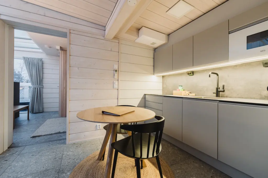 The entrance side of the cabin features a living room, an open kitchen and an alcove with a TV.