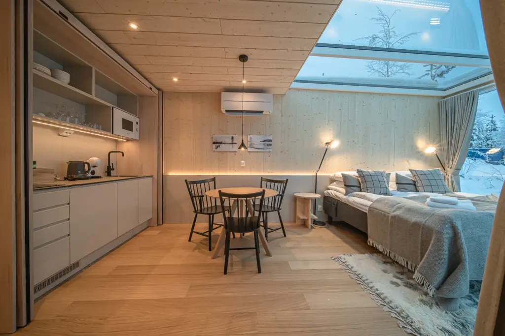 These unique accommodations combine the warmth of a more traditional cabin with the breathtaking views of a glass igloo, allowing you to immerse yourself in the Arctic landscape while enjoying modern amenities. Each cabin offers a clear view of the sky for optimal aurora viewing and stargazing, complete with motorized twin beds, ensuite bathrooms, and complimentary Wi-Fi. Most of our cabins also feature private outdoor hot tubs for an added touch of luxury.